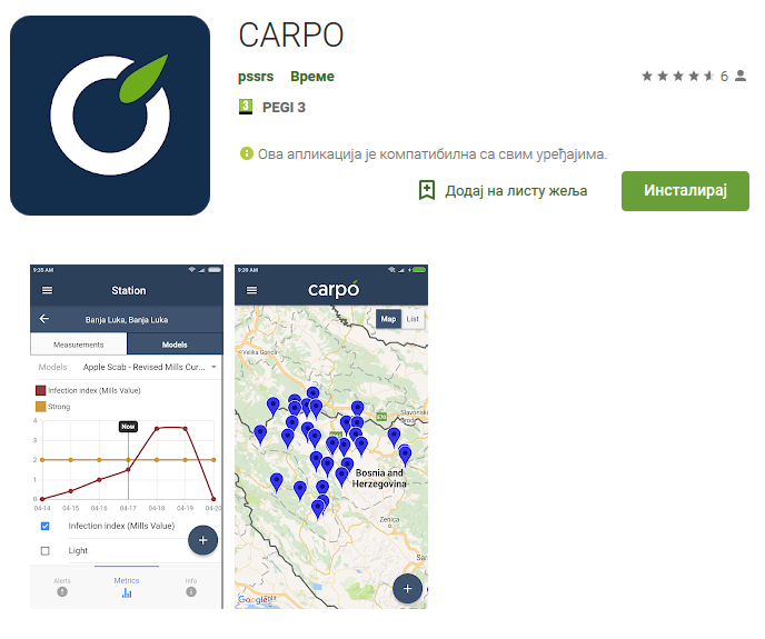 U pitanju je agrometeorološki prognozno-izvještajni web servis Republike Srpske (RS). Ovaj softver poljoprivrednim proizvođačima omogućava pravovremene informacije, na osnovu kojih mogu da zaštite zasade od biljnih bolesti, budu efikasniji i imaju veće prinose. Uz to, ovaj sistem može doprinijeti i znatno manjem korištenju pesticida, odnosno rezultirati zdravijim proizvodima. Korisnicima omogućava da savjetodavcu prijave pojavu bolesti i/ili štetočina na svojim parcelama, uz fotografiju ugroženog usjeva. CARPO je za Ministarstvo poljoprivrede, šumarstva i vodoprivrede RS, razvio DRAXIS, a za Android je, kao i ostale aplikacije s ove liste, dostupna na Google Play-u.